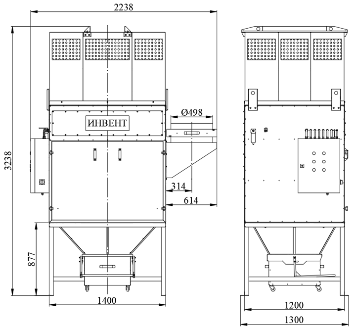 Бункер для сбора пыли, стряхиваемой с картриджей в процессе регенерации, имеет объём 120 л, снабжён роликами для облегчения перемещения.