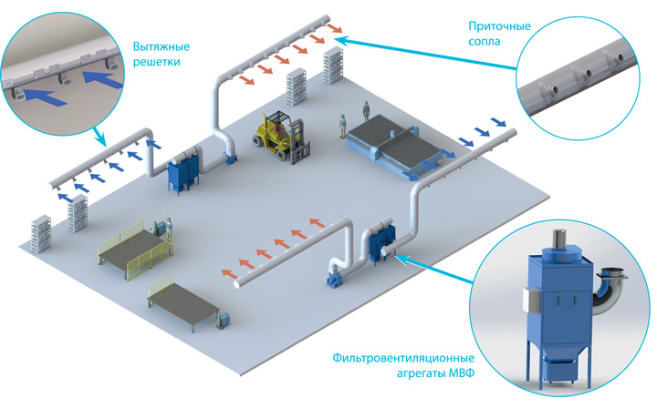 - подачу свежего воздуха к рабочим местам и снижение загрязнений в зоне дыхания.